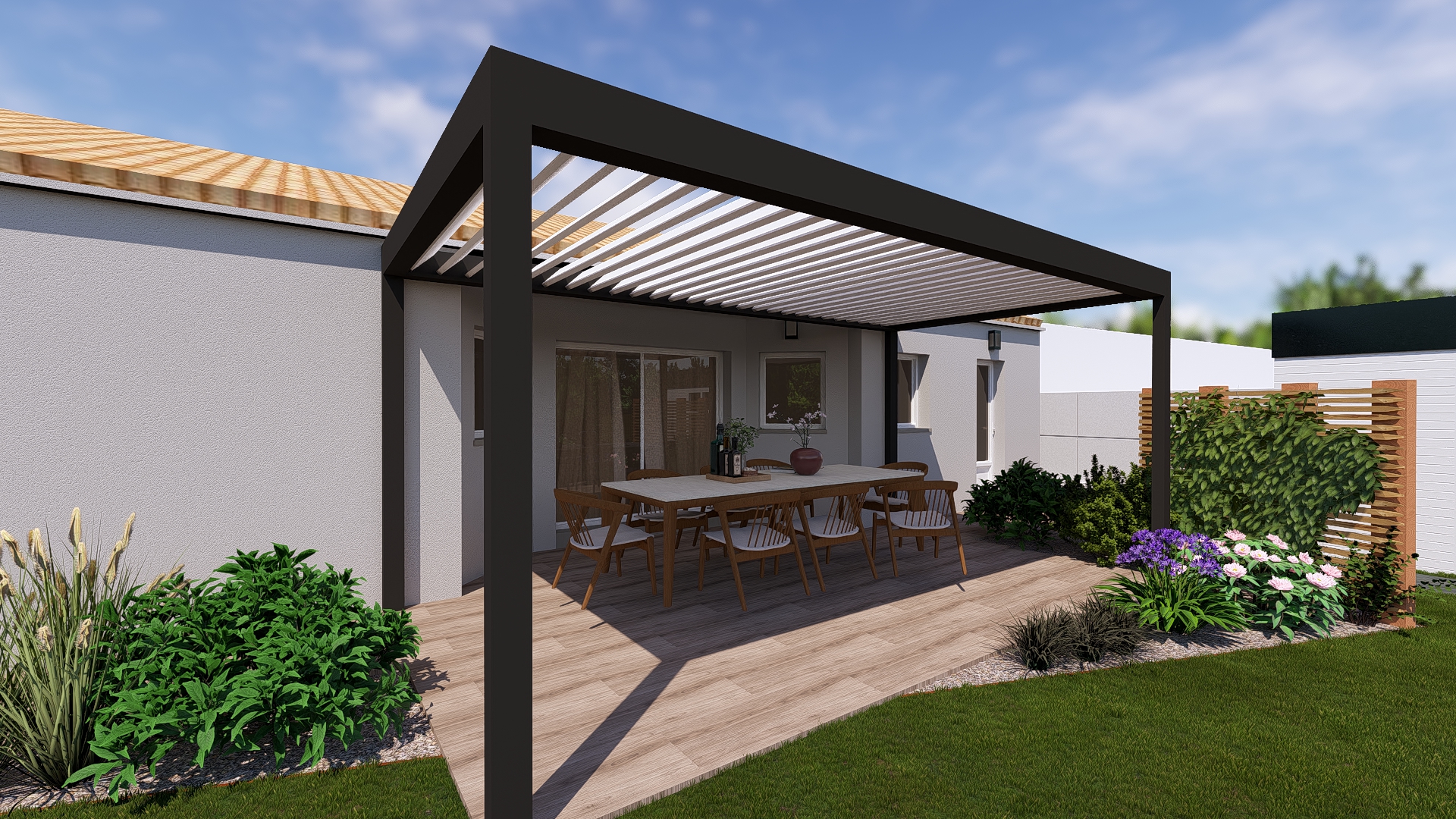 Nous accompagnons les particuliers dans la conception et la réalisation de leurs extérieurs : jardins, terrasses, allées, végétalisation, piscines, pergolas, clôtures et aménagements sur mesure.